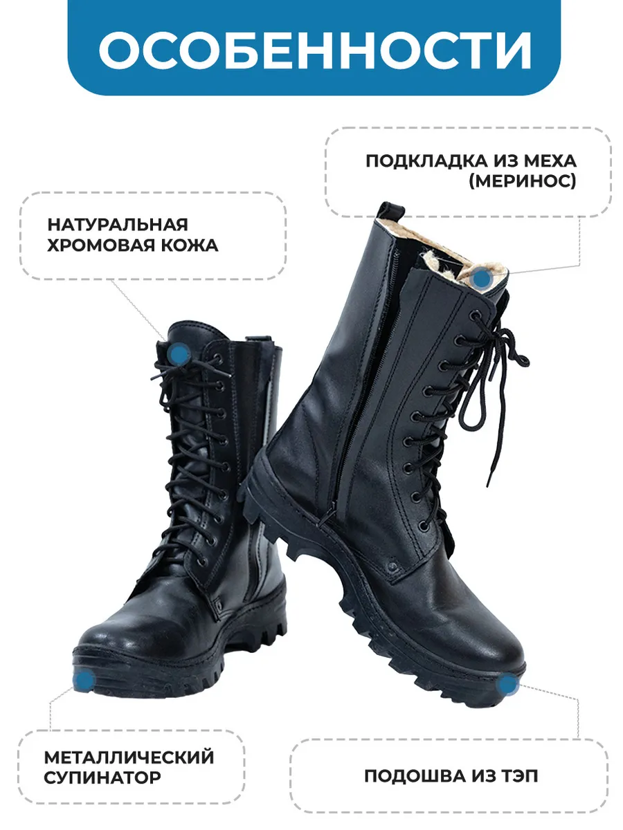 Верх: натуральная хромовая кожа (1.4 – 1.6 мм). Подкладка: мех (меринос).
