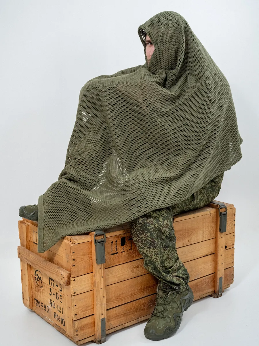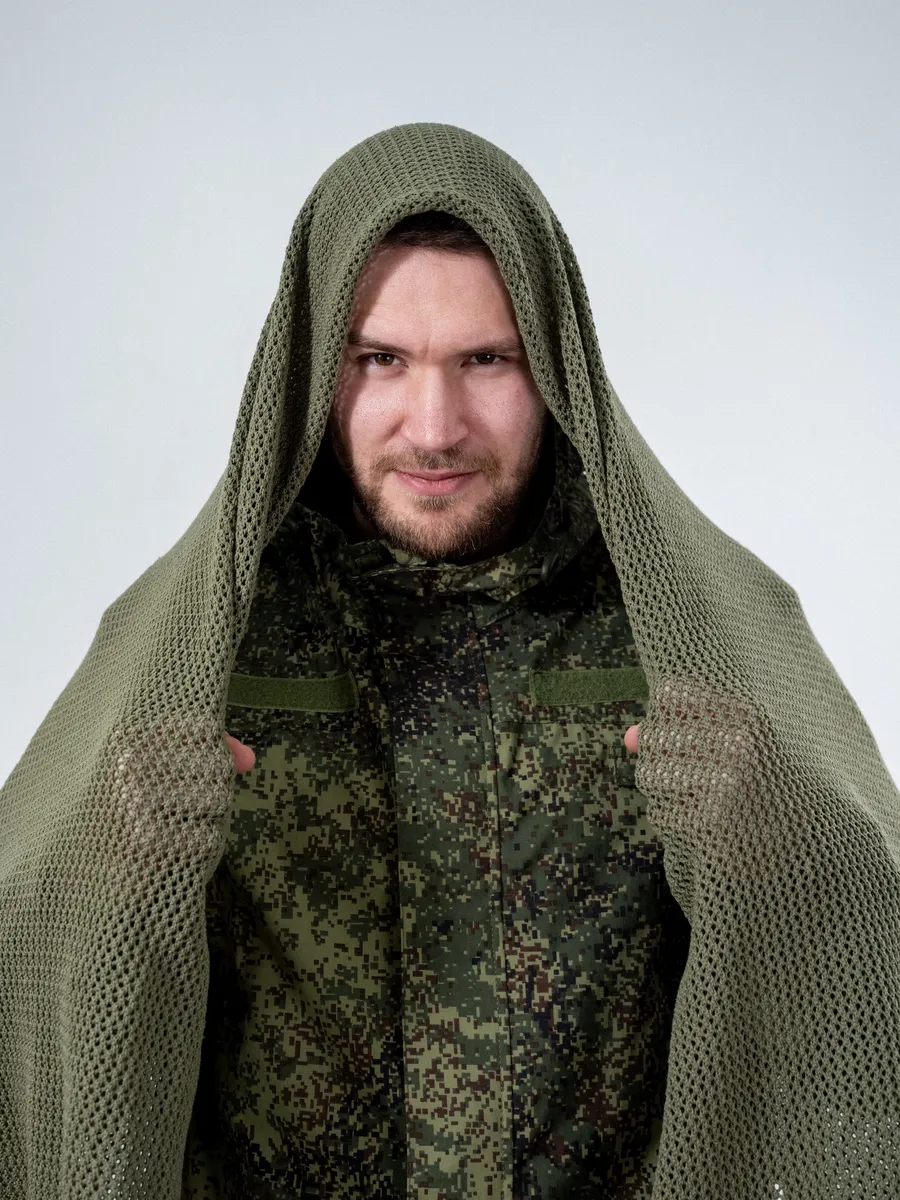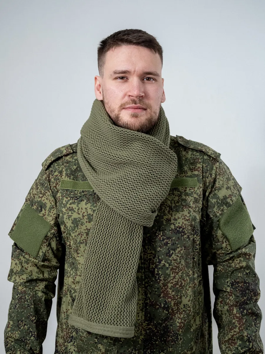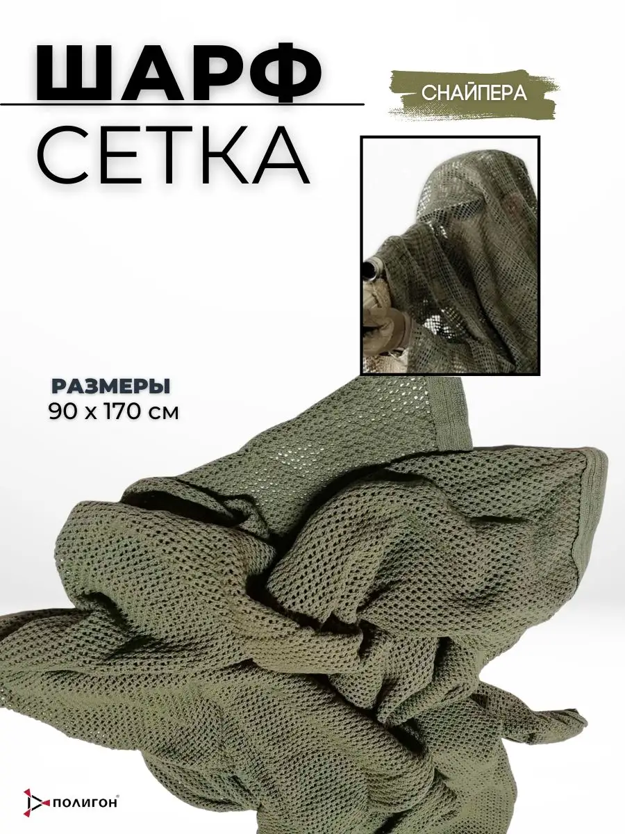 Шарф камуфляжный, сетчатый, снайперский. Шарф тактический удобный многофункциональный элемент камуфляжа изготовлен из прочного, эластичного и дышащего материала полиэстера и хлопка, зеленого-хаки цвета. Большой прямоугольник из мягкой смесовой сетки, размером 90х170см, края обработаны мягкой окантовочной лентой. Полупрозрачная сетка с крупными ячейками закрывает лицо, оптику без заметной потери видимости. Мужской маскировочный шарф-сетку применяют в качестве индивидуального средства укрытия профессиональные снайперы, сотрудники спецслужб, участники спецоперации и охотники. А также игроки страйкбола и пейнтбола, обеспечивая отличную маскировку себе и своему оружию или сопутствующему снаряжению. Снайперский шарф имеет множество вариантов использования в качестве аксессуара для шеи и головы (шарф и бандана, подшлемник, маска или налобная повязка для удерживания пота). В экстренной ситуации можно применить сетку для перевязки, как жгут или достаточно прочную веревку. При сворачивании в несколько слоев, получается фильтр для воды. Можно использовать как силки для птиц или смастерить сачок. Множество вариантов маскировки (накидка на тело, оружие и оптику, различные укрытия и позиции. На рюкзак, бивачный мешок и прочее имущество спецназа). Идеален для охоты, туризма и активного отдыха, рыбалки. Также путешествий, военно-полевых учений, службы. Шарф еще называют снайперский шарф-фата, сетчатый шейный шарф или головная повязка для охоты и рыбалки.