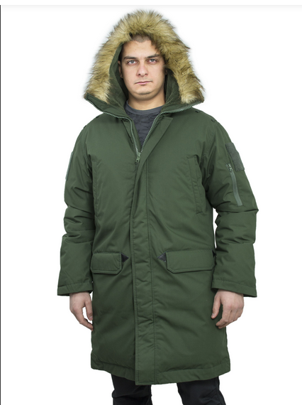 -Воротник — стойка, переходящий в несъёмный капюшон, отороченный искусственным мехом;