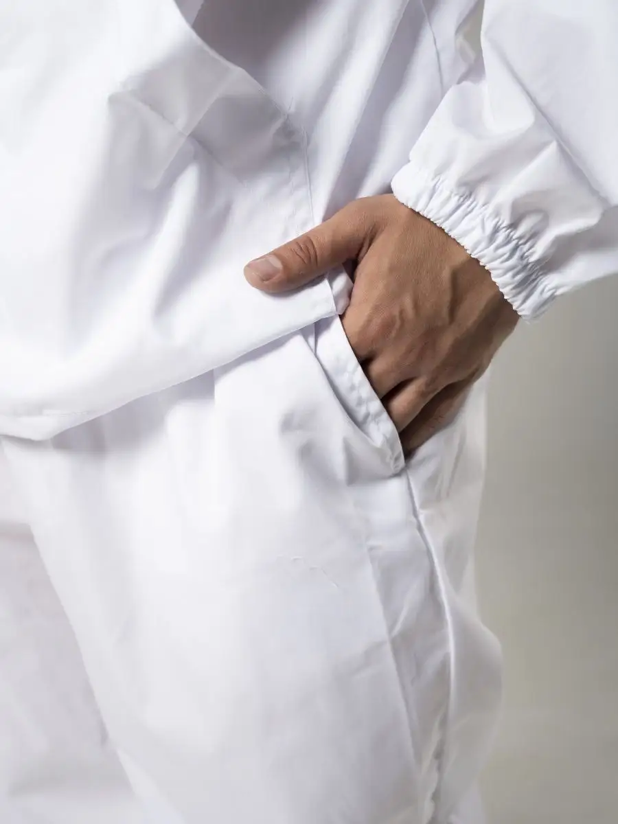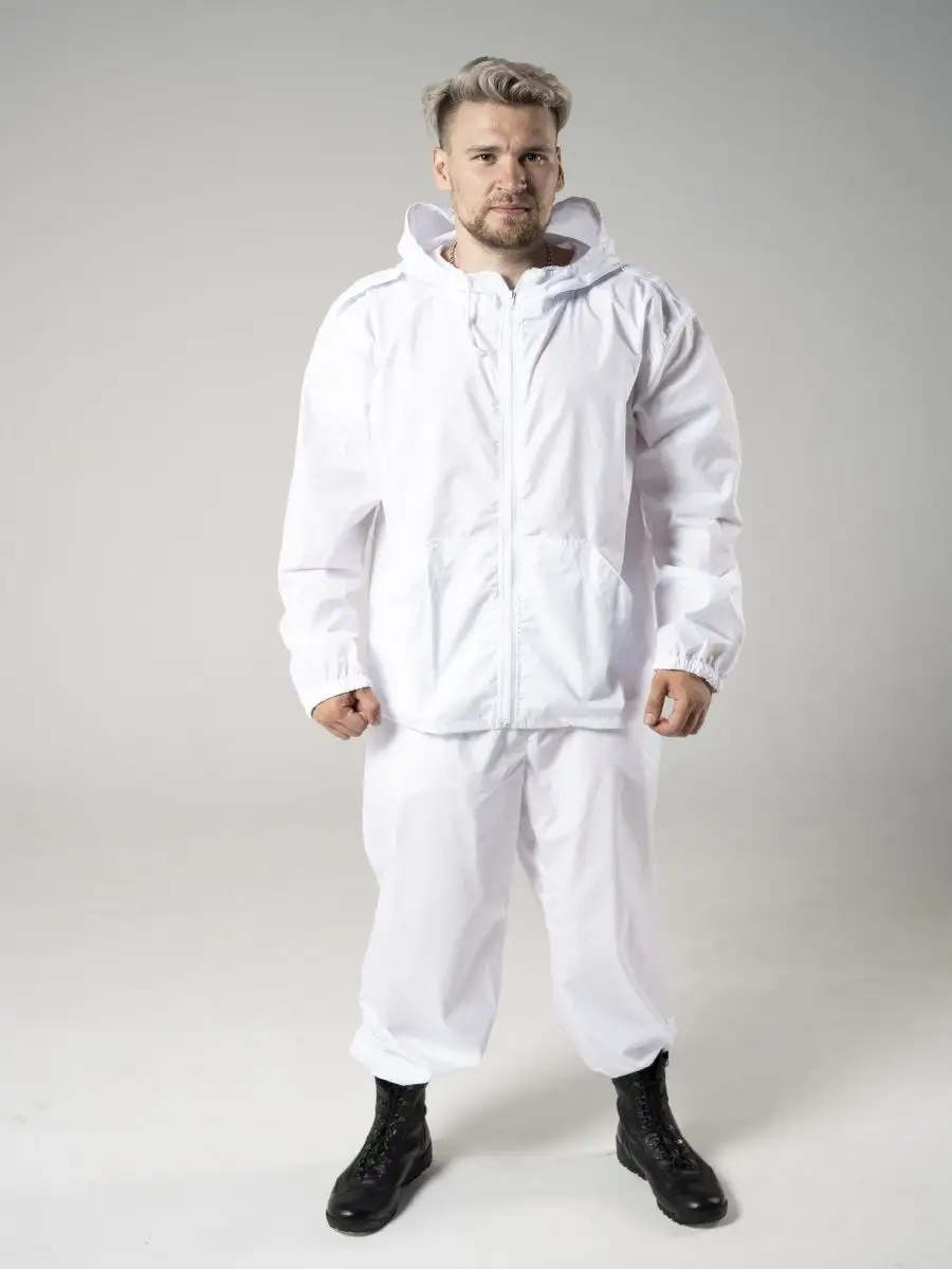Куртка оснащена накладными карманами, застегивается на молнию, капюшон регулируется тесьмой. На рукавах и поясе утягивающая резинка. Брюки на резинке, на конце брюк также утягивающая резинка. Длинна позволяет заправить брюки в ботинки. Свободный крой костюма не сковывает движений даже при интенсивной нагрузке.