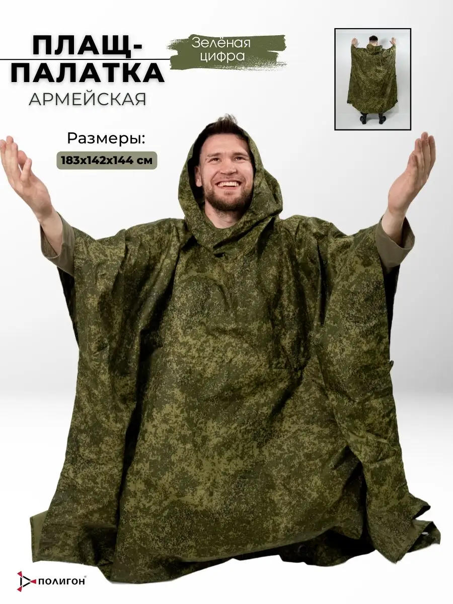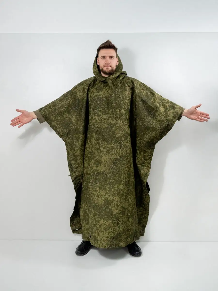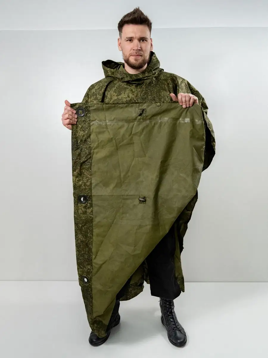 Плащ-палатка накидка специальная или армейский дождевик пончо Спецназа СпН (подразделения специального назначения). Изготовлена из капроновой ткани с полиуретановым покрытием камуфлированной расцветки. Выполнена из целого полотнища, в середине которого расположен капюшон. Швы проклеены и абсолютно герметичны. По периметру установлены люверсы и застёжки, позволяющие использовать её как тент или соединять несколько изделий вместе. На внутренней стороне спереди, располагается большой карман, в него путем обратной выворотки (удобная конструкция хранения сама-в-себе) и складывается плащ палатка после использования, закрываясь на вшитую молнию. В сложенном виде размер около 50х24см. Обычно используется как классическое пончо, или при застегивании рукавов превращается в плащ накидку (формируются рукава). Легко вмещает не только человека любого роста и веса (она всеразмерная, под все росты и габариты), но также заодно вместит и защитит от ветра и любого дождя большой рейдовый рюкзак на спине, и оружие в руках. Капюшон утягивается веревочной затяжкой с пластиковым фиксатором и регулируется как под размеры головы, так и под любые головные уборы, шлемы. При этом легко обеспечивается не ограниченная подвижность и высокая удобность применения. Военный дождевик отлично подходит для армейских войск и горных бригад специального назначения СпН спецназа, но также для туристов, страйкболистов, любителей охоты и рыбалки. Очень нравится эта накидка также грибникам и автомобилистам на случай поломки во время дождя. Плащ уникальный и многофункциональный элемент армейской экипировки, его можно использовать как: тент, козырьки, укрытия шалашей и открытых окопов, подстилка, прикрываются входы в землянки и шалаши, палатка, плащ-дождевик. Военная плащ палатка может послужить реквизитом на фото сессиях, исторических реконструкциях, для съемок исторического кино или боевиках и сериалов, а так же в театральных постановках.