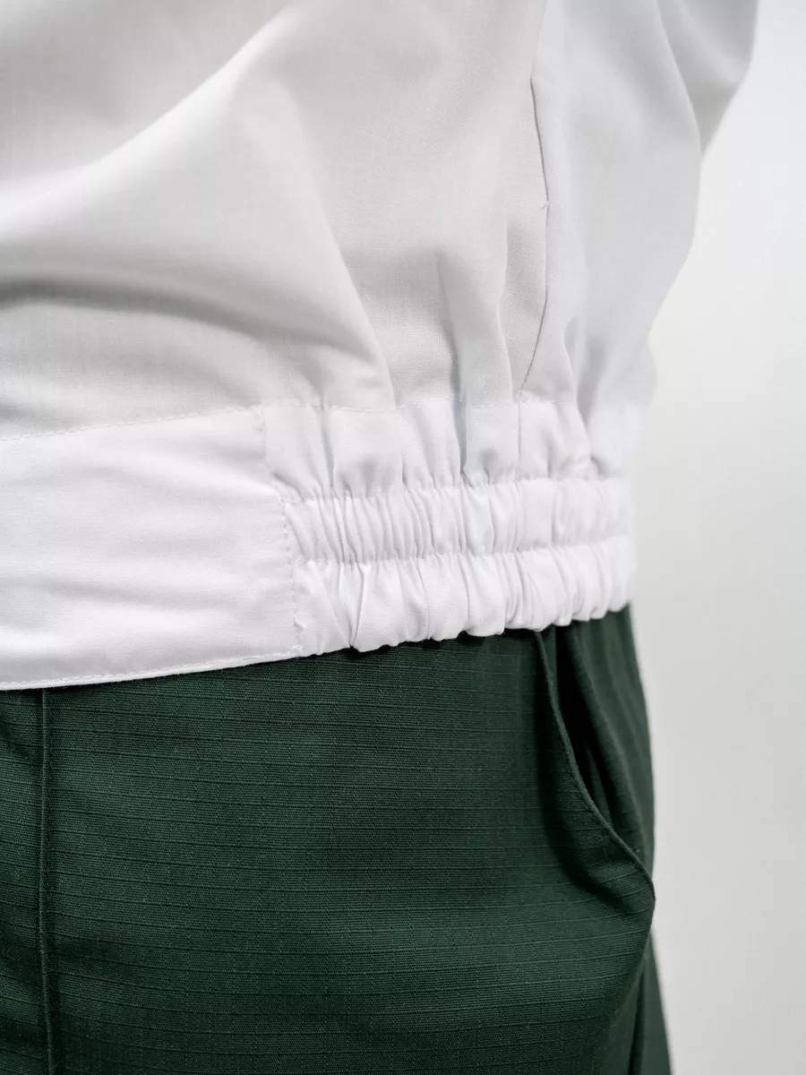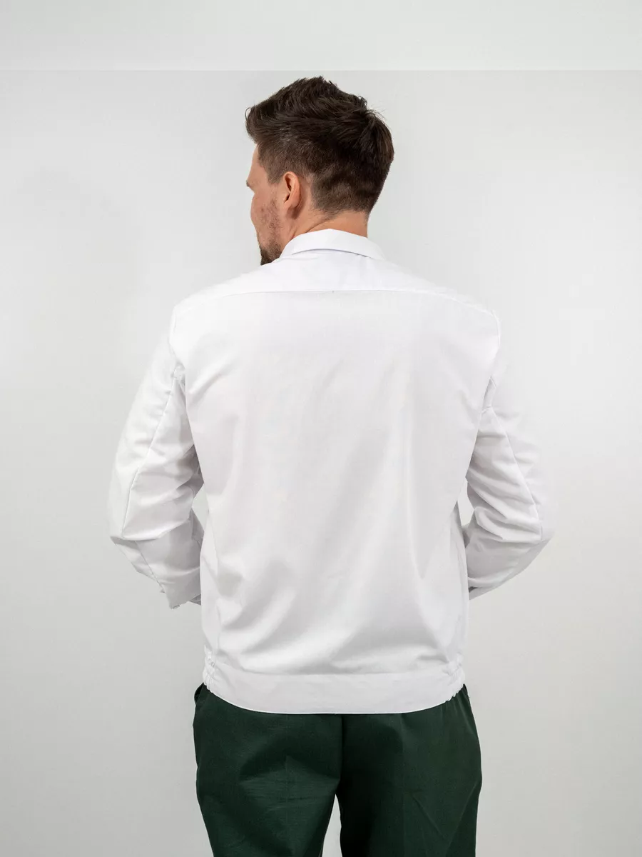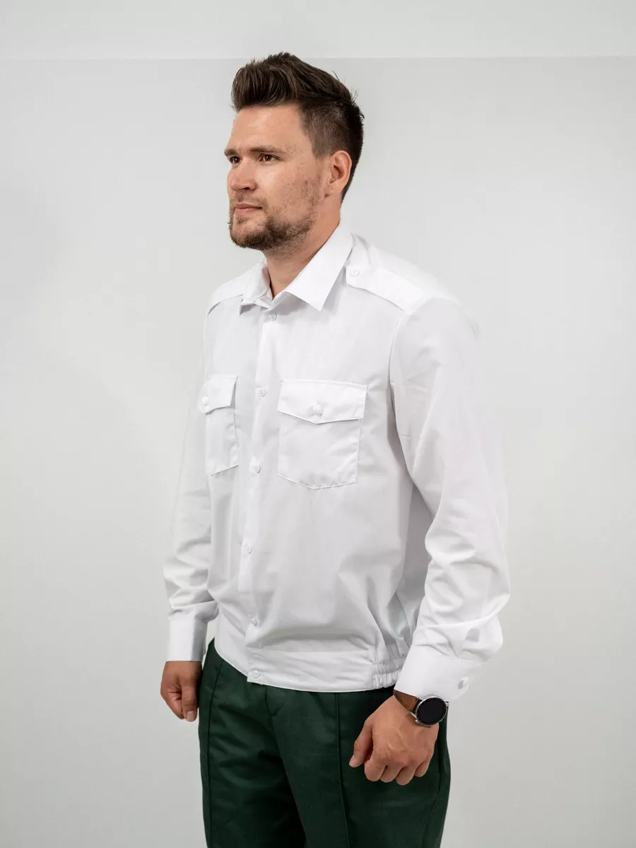 Рубашка РЖД белая мужская длинный рукав. Форменная, летняя рубашка, мужская, РЖД. Белая рубашка свободного кроя с центральной застёжкой на пуговицы, носится с форменными брюками на выпуск. Укороченная модель, внизу в области боковых швов вшиты эластичные ленты в два ряда. Они позволяют регулировать объем и придают аккуратный внешний вид изделию. Воротник отложной, классический, с притачной стойкой. Рукав длинный. На сорочке два накладных, нагрудных кармана, с фигурными клапанами, застегивающихся на пуговицу. Рубашка без шевронов и нашивок. Рубашка пошита из качественной сорочечной ткани (полиэстер-65%; вискоза-35%). Полиэстер отвечает за формоудержание, малоусадочность, прочность и долговечность изделия. Не выцветает на солнце, не портится из-за регулярных стирок. Отличается высокой стойкостью к истиранию, благодаря чему долго сохраняет аккуратный внешний вид. Сорочка РЖД «дышит», комфортна в течение носки. Рубашка уставная подходит для сотрудников РЖД (Российские железные дороги), проводников электропоездов, электричек, сотрудников поездов Сапсан, студентов или кадетов колледжа, школы РЖД.