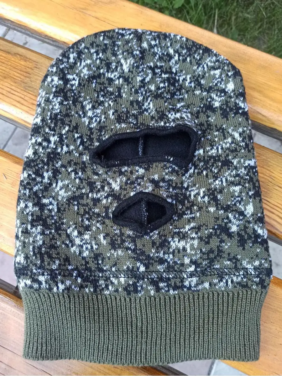 Универсальная шапка, маска балаклава на флисе. Текстильный головной убор камуфляжного, зеленого (зеленая цифра) цвета полностью закрывает голову и шею, оставляя открытыми только глаза и рот, практически полностью исключают узнаваемость. Балаклава тактическая создана для защиты лица от обморожения в условиях аномально низких температур и надежной ветрозащиты. Материал полушерсть, двойной вязки. Шапка, утепленная с внутренней стороны флисом, по низу оформлена широкой резинкой. Приятная на ощупь, не раздражает кожу лица и шеи, гипоаллергенная. Размер универсальный. Подходит мужчинам и женщинам, унисекс. Вязаная балаклава обладает высокими теплосберегающими свойствами, заменяет шапку и шарф-снуд. Защитный аксессуар надевают для активностей в холодное время года: прогулок, езды на снегоходе, катании на сноуборде, лыжах и коньках. А также для зимней рыбалки и охоты, туризма. Балаклава зимняя мужская универсальная, комфортна под военным армейским шлемом или каской. Шапку используют силовые структуры при спецоперациях. Отверстия в маске обеспечивают удобное дыхание, возможность сделать глоток воды или перекусить, не ограничивает и не искажает речь.